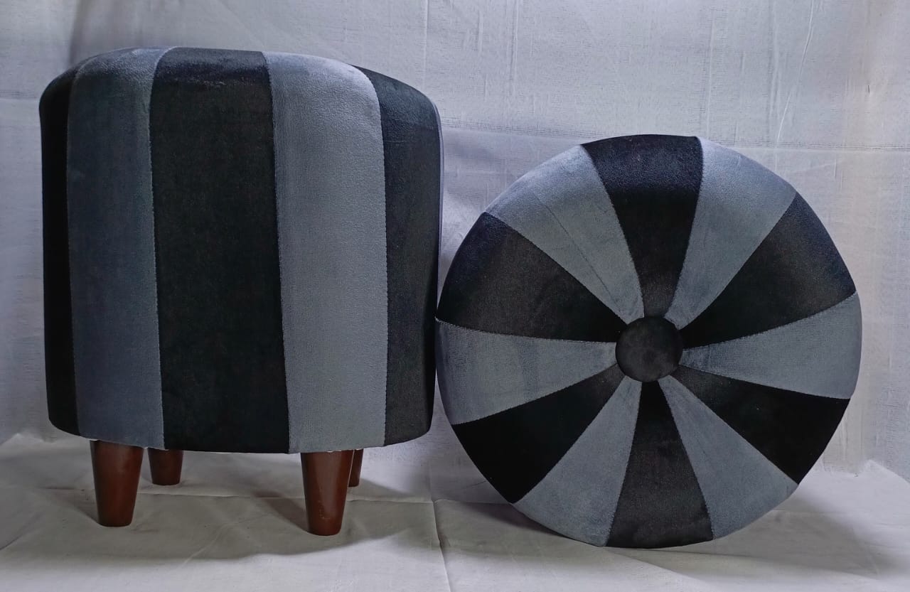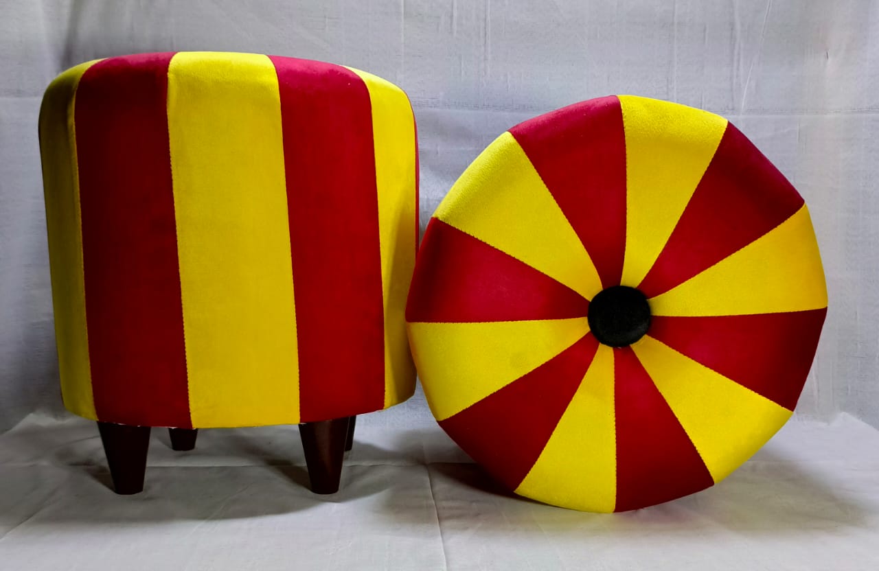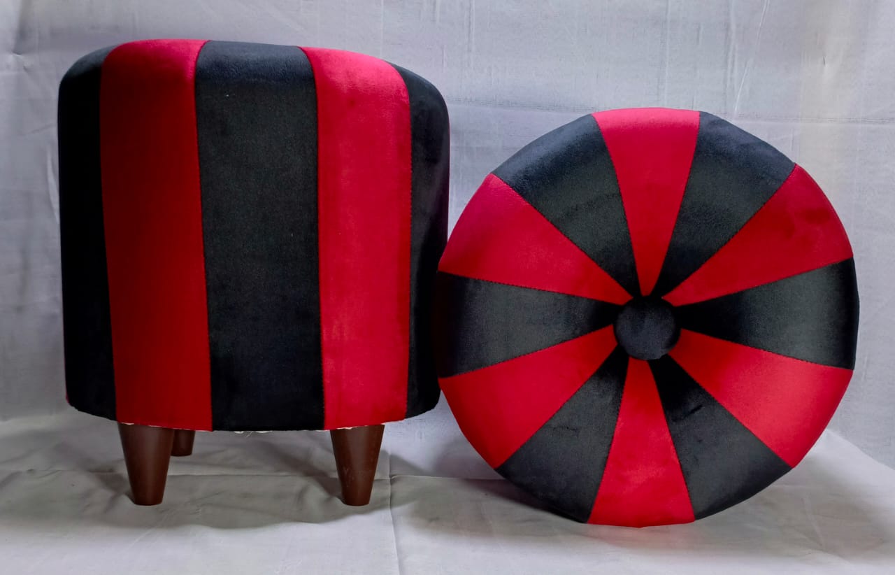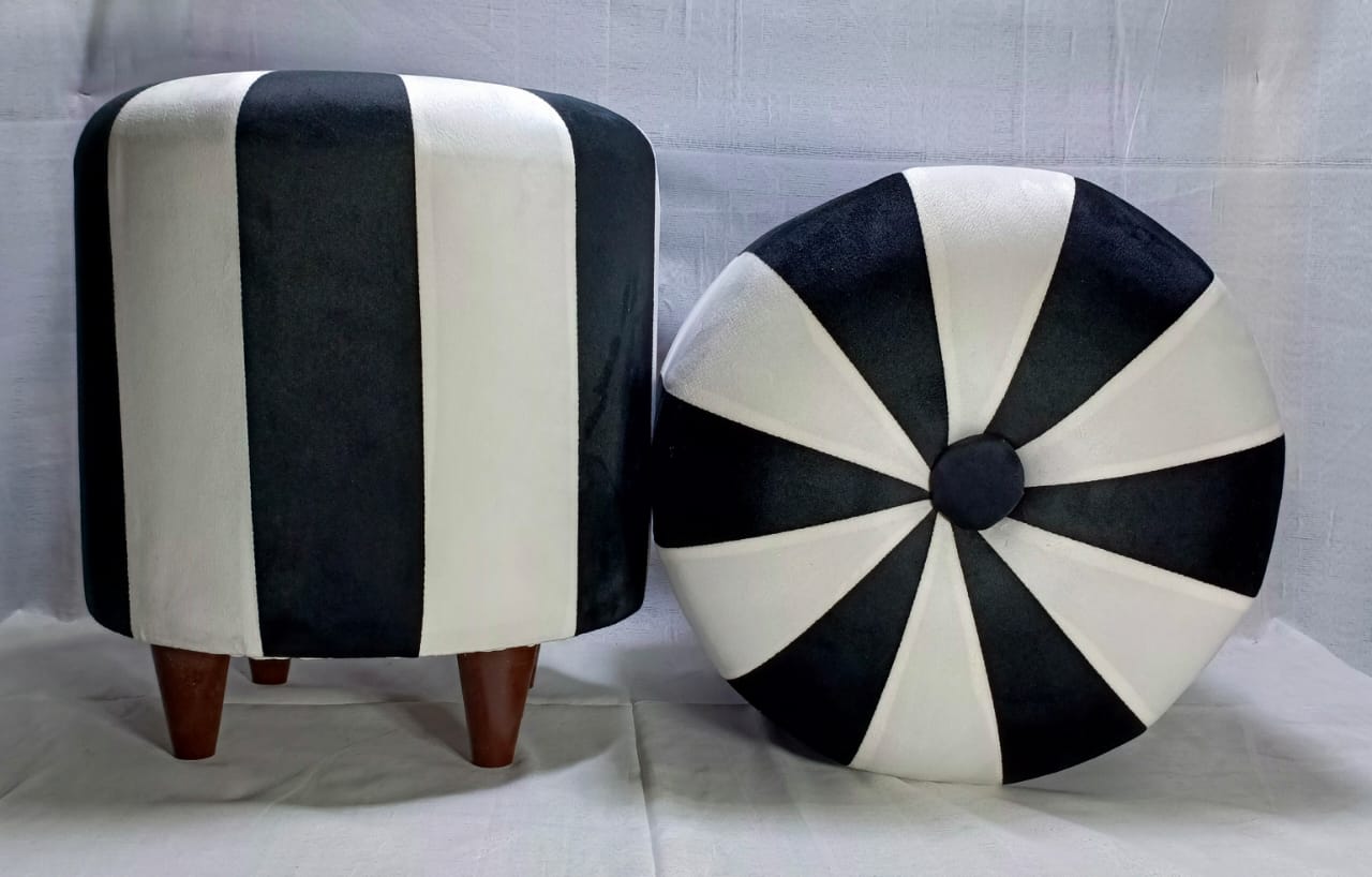 Elevate your home décor with this contemporary morra stool set featuring a unique striped and starburst pattern. Crafted with plush velvet and sturdy wooden legs, these stools combine comfort and style for your living room, bedroom, or lounge.