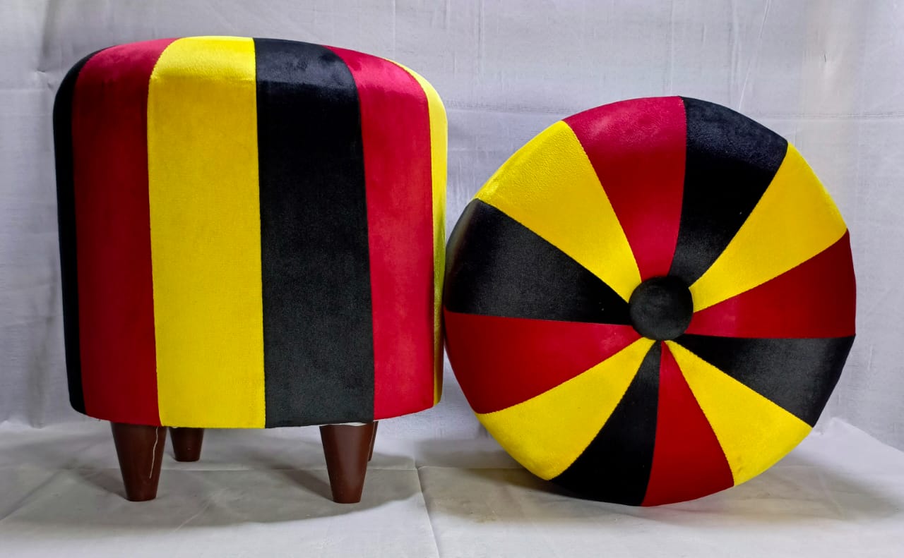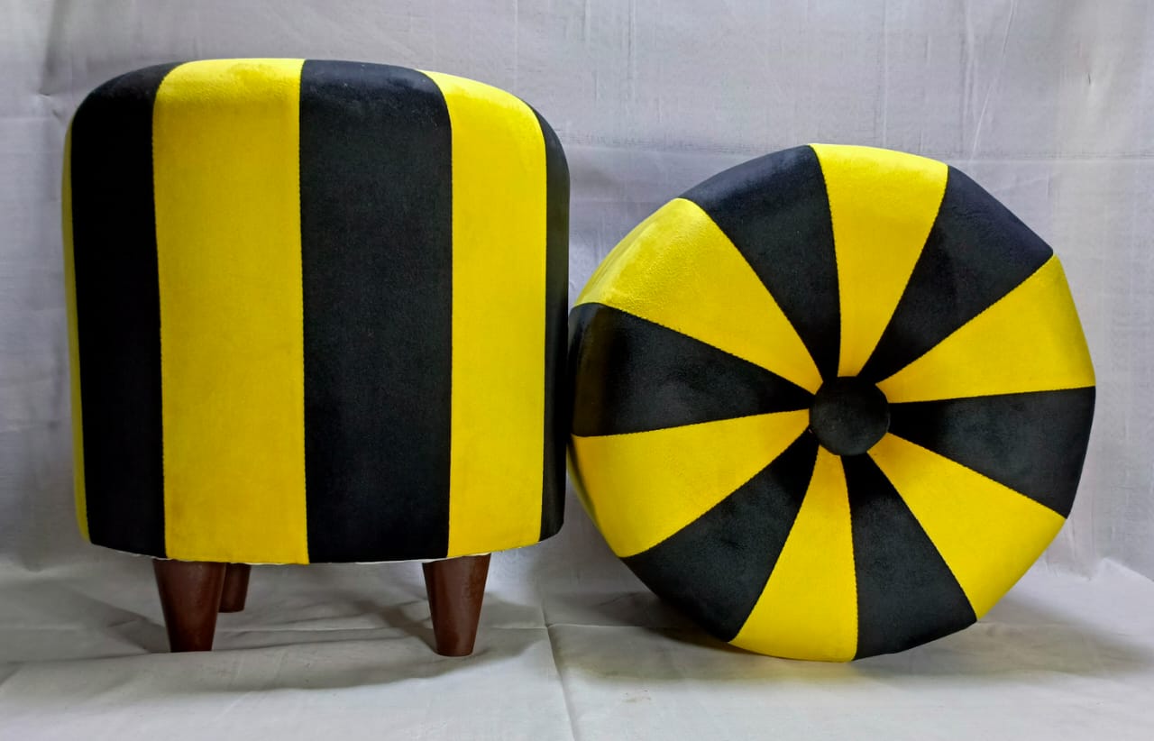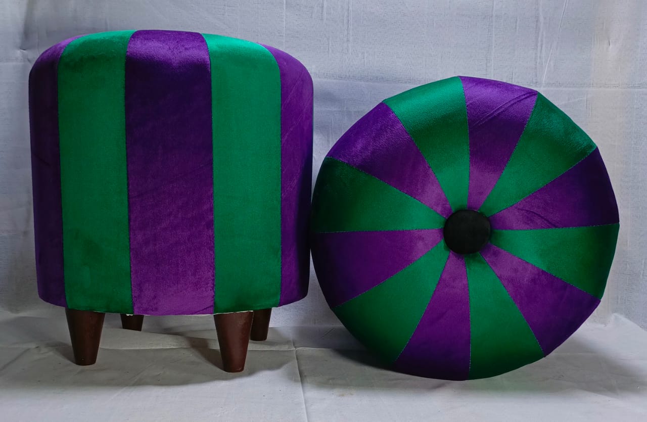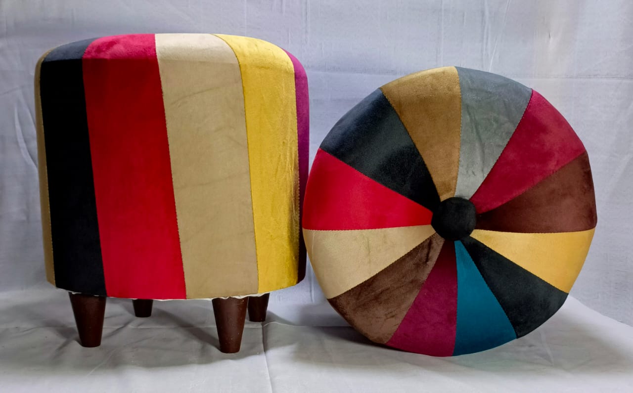 Elevate your home décor with this contemporary morra stool set featuring a unique striped and starburst pattern. Crafted with plush velvet and sturdy wooden legs, these stools combine comfort and style for your living room, bedroom, or lounge.