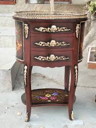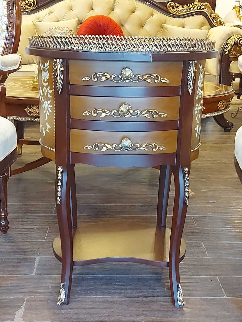 Elevate your space with this elegant Victorian-inspired side table, featuring rich emerald green drawers adorned with gold floral naqashi detailing. Crafted with ornate carvings, this piece is perfect for adding regal charm to any interior.