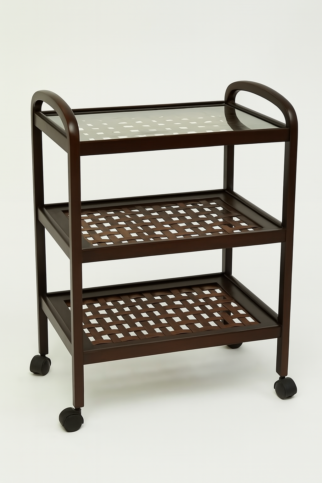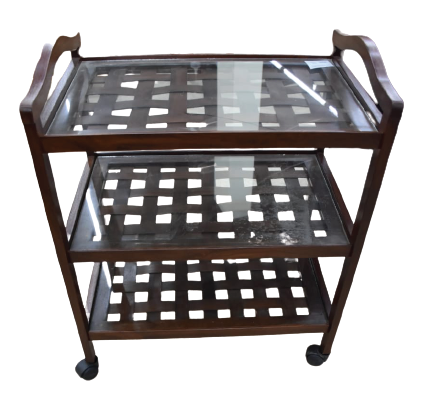 Crafted from premium Sheesham wood, this 3-tier tea trolley features a unique lattice design with sturdy glass shelves. Perfect for serving guests or organizing essentials, it combines durability with timeless elegance. Smooth-rolling wheels ensure effortless mobility across any space.